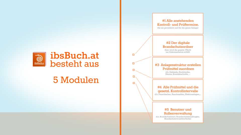 Unser ibsBuch.at ist Ihre intelligente Lösung für ein digitales Brandschutzbuch. Unsere Brandschutz Software unterstützt Sie bei allen Aufgaben des vorbeugenden Brandschutzes und dient als revisionssichere Dokumentation gemäß TRVB. Ideal für Betriebe, Institutionen und Gebäudeverwalter, die ihre Brandschutzdokumentation effizient, rechtssicher und digital führen möchten.